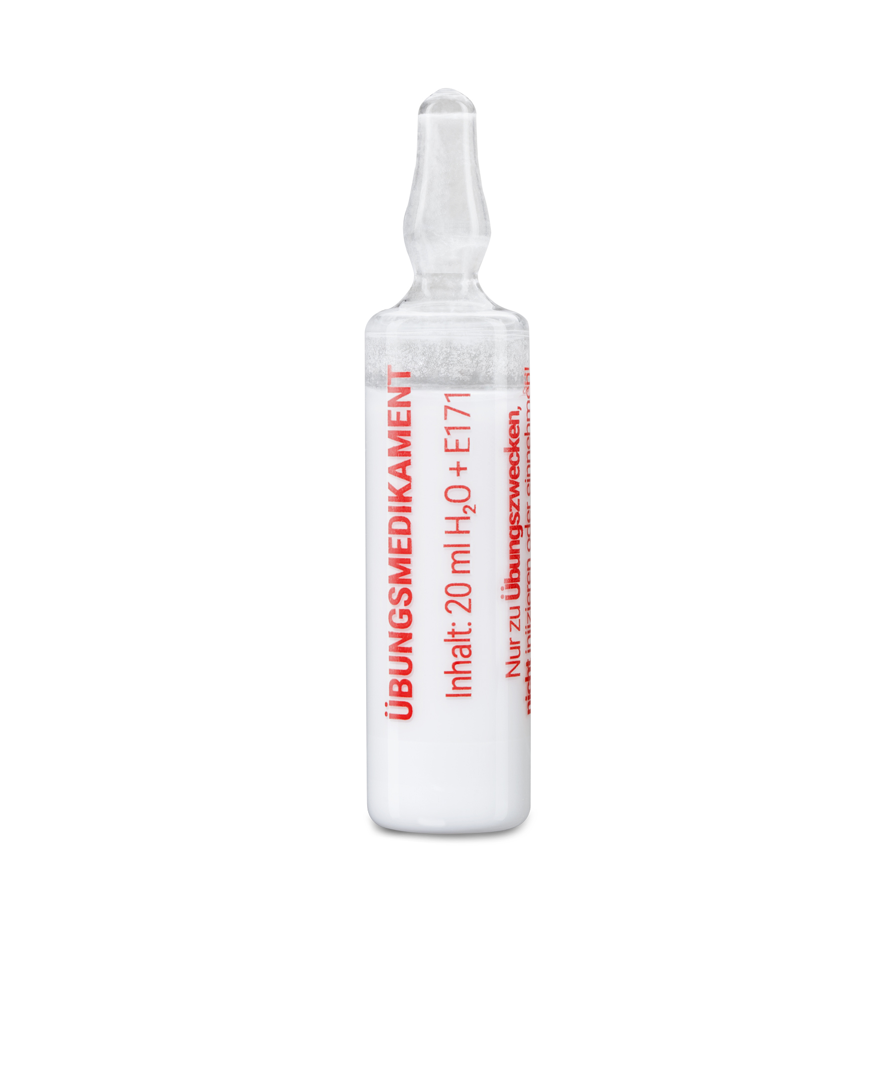 Glasbrechampulle (One-Point-Cut), Inhalt 5 ml getrübtes dest. Wasser, Ersatz für Medikamente wie z.B. Dormicum®, Midazolam®, Beloc®, Anticholium®, Ketanest®S, Tranexamsäure usw.